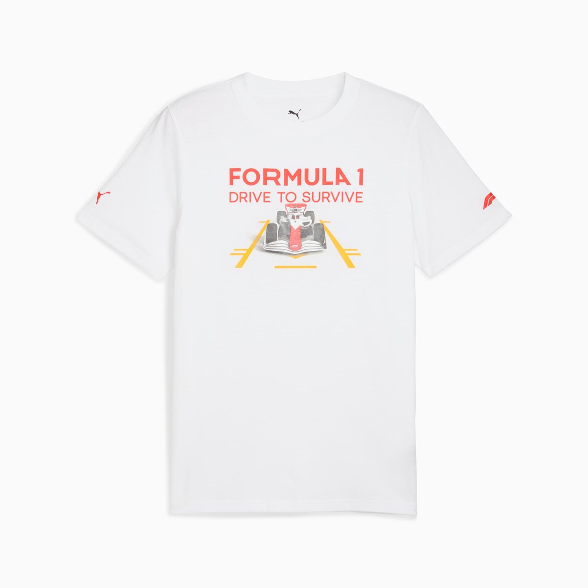 Perfect for “Drive to Survive” fans, this PUMA tee features authentic Drive to Survive graphics, a classic crew neck, and bold F1® and PUMA Cat logos. Embrace the adrenaline and celebrate your passion for racing with every wear.