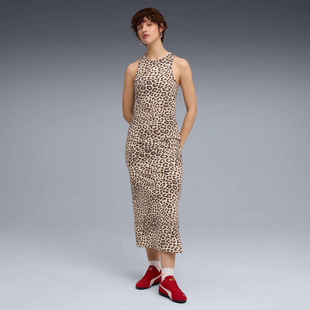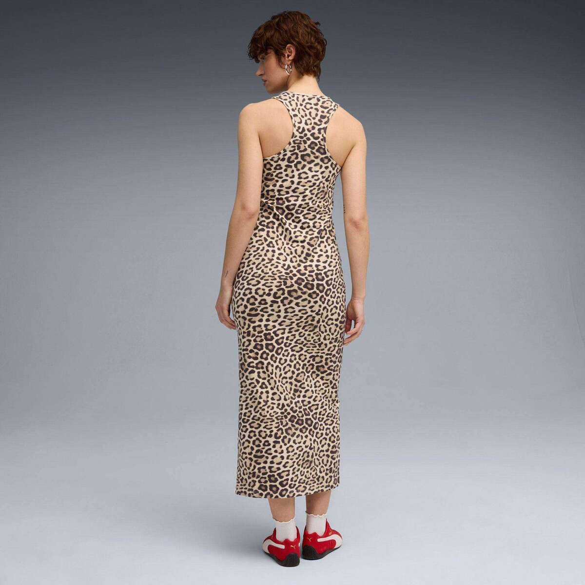 Turn heads with this fierce leopard print dress. Featuring a racer top neckline, side slit, and a sleek PUMA Cat Logo embroidery, it’s perfect for making a bold statement. Unleash your wild side and own the moment with PUMA.