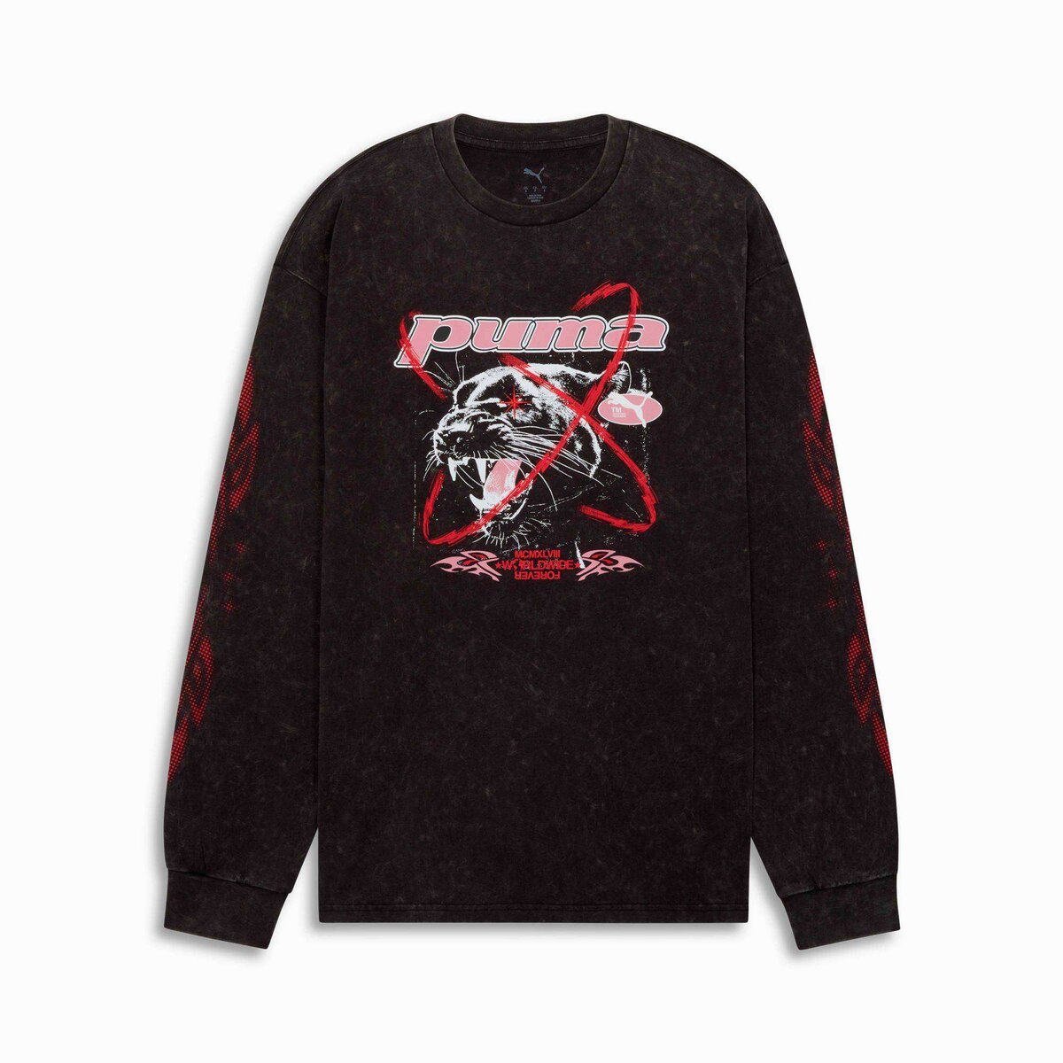 Make a statement with dropped shoulders and stone-washed fabric for effortless oversized vibes. Graphic details on the chest and sleeves combine rubber, puff print, and embroidery for dynamic texture play. Ribbed cuffs keep it cozy, whether you’re relaxing or on the go. Bold moves, always powered by PUMA energy.